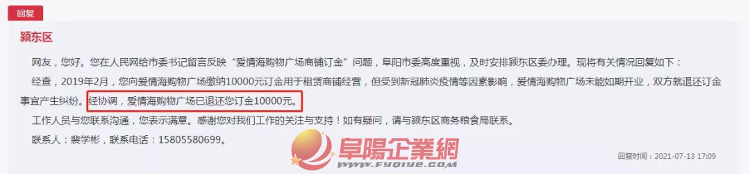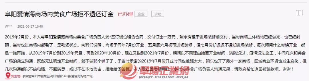 近日 有網(wǎng)友反饋 阜陽愛情海商場內 2019年2月份,本人與阜陽愛情海商場內美食廣場負責人龔*簽訂鋪位租賃合同,交付訂金一萬元,剩余房租于進場裝修前交付,當時商場主體結構已經(jīng)做完,也已經(jīng)封頂,當時也進商場內部看了,呈毛坯狀態(tài)。向我們說明,商場于同年7月份開業(yè),五月底六月初可進場裝修,但七月份卻遲遲不通知進場裝修,每次詢問什么時候開業(yè),都是一拖再拖,從2019年7月份到2019年元旦,再到2020年10月份,現(xiàn)在又說到2021年7月份,期間以不同理由搪塞開業(yè)時間,消防沒過,疫情沒法施工,中間幾次和美食廣場的龔立溝通,既然無法確定開業(yè)時間,就不做那個鋪子了,于當時承諾的2019年7月份開業(yè)時間也差距太大,潁東也開了另外一家商場,區(qū)域商業(yè)環(huán)境也發(fā)生變化,但幾次溝通都以不接電話、不回消息,或以不在本地為由,拒絕給予答復。本人現(xiàn)在因急需用錢,多次與美食廣場負責人溝通無果,請政府幫忙追回被騙款項。謝謝! 對此 潁東區(qū)做出了回應 網(wǎng)友,您好。您在人民網(wǎng)給市委書記留言反映“愛情海購物廣場商鋪訂金”問題,阜陽市委高度重視,及時安排潁東區(qū)委辦理。現(xiàn)將有關情況回復如下: 經(jīng)查,2019年2月,您向愛情海購物廣場繳納10000元訂金用于租賃商鋪經(jīng)營,但受到新冠肺炎疫情等因素影響,愛情海購物廣場未能如期開業(yè),雙方就退還訂金事宜產生糾紛。經(jīng)協(xié)調,愛情海購物廣場已退還您訂金10000元。 工作人員與您聯(lián)系溝通,您表示滿意。感謝您對我們工作的關注與支持!如有疑問,請與潁東區(qū)商務糧食局聯(lián)系。 聯(lián)系人:裴學彬,聯(lián)系電話:15805580699。 來源:人民網(wǎng)領導留言板 |
