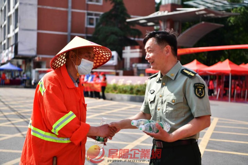 圖為文峰街道武裝部馮常武為紅旗中學(xué)值班環(huán)衛(wèi)工人送清涼