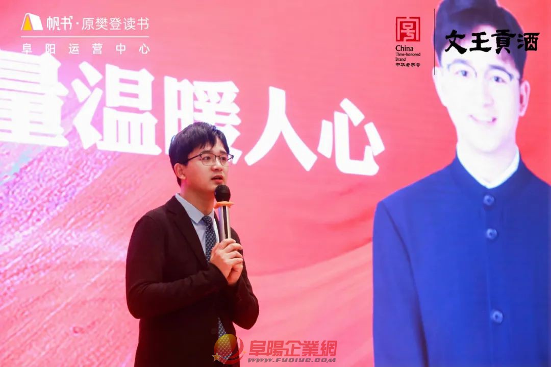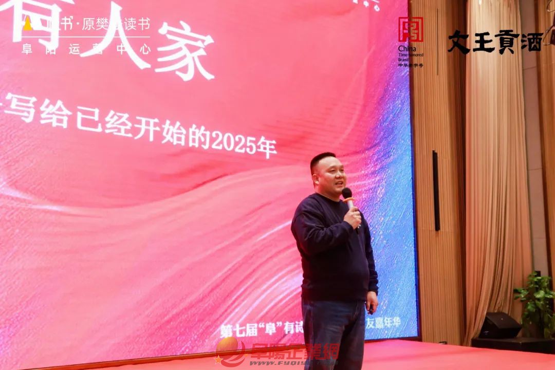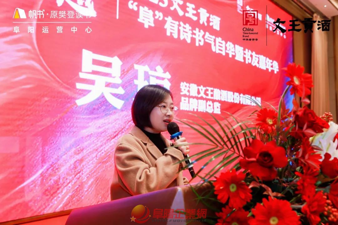 時(shí)間總在不經(jīng)意間悄悄流逝 新的一年悄無(wú)聲息地到來(lái) 站在歲末回望過(guò)去 2024年有太多的感動(dòng)和故事 站在年初展望未來(lái) 2025年有更多的期望與夢(mèng)想 在這辭舊迎新之際 我們?cè)俅锡R聚一堂 共享閱讀之樂(lè) 文王貢酒 帆書(shū)第七屆“阜”有詩(shī)書(shū)氣自華 暨書(shū)友嘉年華活動(dòng) 本次年會(huì)以 “閱讀的力量”為主題 五位嘉賓采用演講的方式 為書(shū)友們帶來(lái)全方位、有深度 有溫度的內(nèi)容分享 也為大家?guī)?lái)一場(chǎng) 火花四溢的知識(shí)盛宴 不僅是對(duì)過(guò)去一年閱讀旅程的總結(jié) 更是對(duì)未來(lái)書(shū)香之路的美好期許 下午3:00分 伴隨著嘉賓、書(shū)友簽到入場(chǎng) 在主持人的開(kāi)場(chǎng)下 活動(dòng)正式拉開(kāi)序幕 隨著音樂(lè)的結(jié)束 現(xiàn)場(chǎng)響起了熱烈的掌聲 接著安徽文王釀酒股份有限公司 品牌部副總監(jiān)吳瓊女士 為本次活動(dòng)致詞: 今年 是我們與帆書(shū)“阜有詩(shī)書(shū)氣自華”活動(dòng) 攜手共進(jìn)的第三載 人生如海 好書(shū)是帆 這份持久的合作 源于我們對(duì)阜城文化盛宴的 共同打造與執(zhí)著追求 愿我們?cè)跁?shū)香與酒香的交織中 共同開(kāi)啟一段嶄新的文化之旅 攜手迎接更加美好的明天