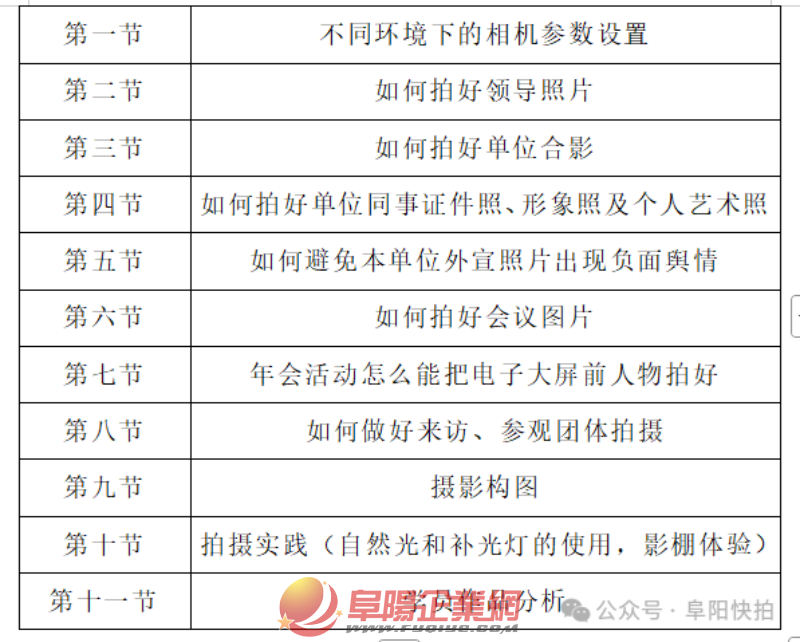 如果你是一名企事業(yè)單位宣傳員,是否在為手拿萬元相機(jī),拍不出領(lǐng)導(dǎo)贊賞的照片而苦惱? 阜陽快拍攝影俱樂部(原阜陽文振職業(yè)培訓(xùn)學(xué)校)已成功舉辦多期攝影培訓(xùn)。針對(duì)市場需求,2026新年伊始,將繼續(xù)開辦攝影培訓(xùn)班。本期開班面向企事業(yè)單位宣傳人員,實(shí)行小班教學(xué),10人開班。兩天的時(shí)間你將會(huì)學(xué)到:如何拍好領(lǐng)導(dǎo)照片、來訪參觀照、會(huì)議新聞?wù)?、?huì)議電子屏前照片拍攝和不同環(huán)境下相機(jī)參數(shù)設(shè)置、如何避免本單位外宣照片出現(xiàn)負(fù)面輿情等…… 一、該攝影班由中國攝影家協(xié)會(huì)會(huì)員、新華社、人民網(wǎng)簽約攝影師,阜陽日報(bào)原資深攝影記者戴文學(xué)主講。以理論與實(shí)踐教學(xué)相結(jié)合,讓你快速提升攝影技能!培訓(xùn)結(jié)束后統(tǒng)一頒發(fā)結(jié)業(yè)證書,對(duì)優(yōu)秀學(xué)員可推薦加入各級(jí)攝影家協(xié)會(huì)和中國民俗攝影家協(xié)會(huì)等,并負(fù)責(zé)長期技能指導(dǎo)! 二、開班時(shí)間:報(bào)名滿10人開班 上課時(shí)間:兩天(全天) 三、培訓(xùn)費(fèi)用:原價(jià): 四、上課地址:阜陽市潁州區(qū)潁淮大道488號(hào)朝陽古玩城6樓。 五、報(bào)名電話:15551300003 18325819950 微信同號(hào) 企業(yè)新聞攝影培訓(xùn)課程表 遇見老師--戴文學(xué) 獲獎(jiǎng)項(xiàng)目 1.2013年“尊老愛老敬老養(yǎng)老”孝心行動(dòng)攝影藝術(shù)展覽優(yōu)秀收藏大獎(jiǎng),并授予“孝和文化”民間推廣公益大使稱號(hào); 2. 《軍民魚水情》安徽省第十八屆攝影藝術(shù)展 “記錄類”銀獎(jiǎng),攝影作品; 3. 《101歲抗戰(zhàn)老兵回家探親》入選安徽省第二十屆攝影藝術(shù)展覽并獲銅獎(jiǎng),攝影作品;4.《紀(jì)念碑下的守護(hù) 》(組圖)榮獲安徽省第二屆“雙擁杯”攝影 4. 大賽一等獎(jiǎng),攝影作品;5.《國家非遺潁上花鼓燈的傳承》榮獲“非遺 5. 文化薪火相傳”安徽省非物質(zhì)文化遺產(chǎn)全國攝影圖片展“美篇號(hào)”、“公眾號(hào)”類優(yōu)秀獎(jiǎng);6. 《孤島有愛,1個(gè)和7個(gè)的最后堅(jiān)守》被新華社“新時(shí)代” 6. 用鏡頭發(fā)現(xiàn)美2017安徽年度圖片人文關(guān)懷入圍獎(jiǎng)。 期間擔(dān)任 1. 中國攝影家協(xié)會(huì)會(huì)員 2. 新華社簽約攝影師 3. 人民圖片網(wǎng)簽約攝影師 4. 光明圖片網(wǎng)簽約攝影師 5. 中國新聞圖片網(wǎng)簽約攝影師 6. 視覺安徽簽約攝影師 7. 安徽省攝影家協(xié)會(huì)會(huì)員 8. 阜陽市攝影家協(xié)會(huì)會(huì)員。 其攝影作品多次被《新華社》《人民日報(bào)》《光明日報(bào)》《農(nóng)民日報(bào)》《安徽日報(bào)》等國家級(jí)報(bào)刊和網(wǎng)絡(luò)采用。 遇見老師--韓振 獲獎(jiǎng)項(xiàng)目 1.2020視覺中國《珍藏少年的你》“致青春”攝影大賽優(yōu)秀獎(jiǎng); 2. 第三屆中國(無錫)“禮贊農(nóng)民工”攝影比賽二等獎(jiǎng); 期間擔(dān)任 1. 人民網(wǎng)簽約攝影師 2. 視覺中國簽約攝影師 3. 鳳凰網(wǎng)安徽簽約攝影師 4. 騰訊網(wǎng)攝影師 新媒體運(yùn)營人,運(yùn)營自媒體號(hào)“快拍”,在今日頭條、騰訊網(wǎng)、百度百家號(hào)、大魚、梨視頻等平臺(tái)發(fā)稿超過1400條,總閱讀量約10億左右。 來源|阜陽快拍 |